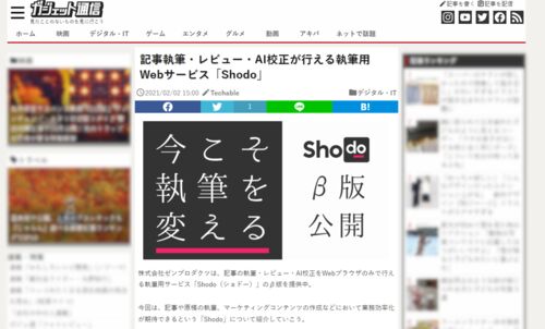 2021年2月2日、ガジェット通信にShodo(ショドー)の紹介記事が掲載されました。 https://getnews.jp/archives/2932294 (記事の内容はTechableからの引用となっています) ガジェット通信 ガジェット通信はネット上の面白いもの、便利なガジェット、笑える…