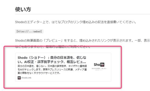 [リンク:embed] が使いたい! という声にお応えして、Shodoのプレビューで、はてなブログのリンク埋め込みに対応しました。 リンク埋め込み:[https://shodo.ink/:embed] はてなフォト埋め込み:[f:id:hirokiky:20200922123025j:plain] Amazonリンク埋め込み…